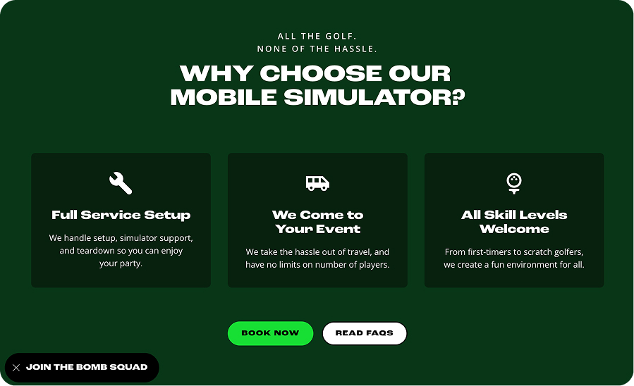 BOMB BAYS launched with a complete brand identity and a website built to convert visitors who had never heard of mobile golf simulator rentals into paying customers. The site handles the full explanation and booking funnel without requiring a sales call.